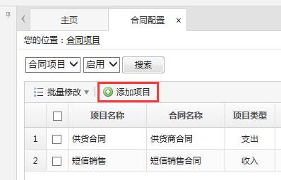 此功能用于管理合同项目;1、【办公】>【合同管理】>【合同配置】2、在合同配置页面,点击“添加项目”打开合同项目添加页面;