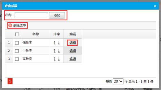 3、页面上面是添加功能,输入名称后点击添加即可完成难度系数的添加;选中需要删除的难度系数,点击“删除选中”即可删除难度系数;点击表格“操作”列“编辑”可编辑难度系数;